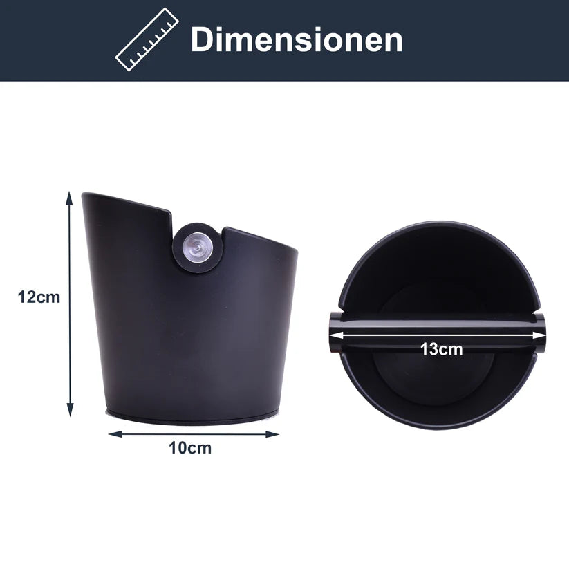 Abschlagbehälter aus schwarzem schlagfesten Kunststoff für einfach Abschlagen des Espressos aus dem Siebträger. Er ist spülmaschinenfest und natürlich lebensmittelecht. Mit einem Gummi an der Unterseite für einen rutschfesten Stand. Der Abschlagbalken ist aus einem Massiven Aluminium und ummantelt mit einem lebensmittelechten SIlikon ummantelt, so ist der Abschlagstab fest eingesetzt und springt nicht raus beim Abschlagen und ist gut Geräusch gedämpft.