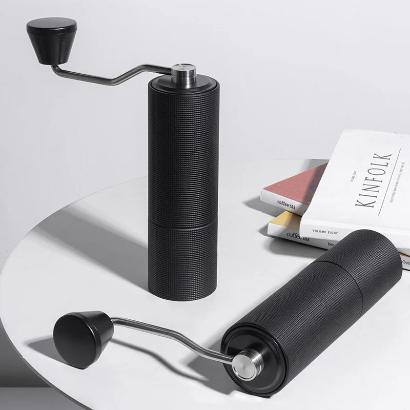 - DISTINCTIVE LOOK & FEEL: Combing with diameter of 52mm and an unique anti-slip textured makes this manual burr coffee grinder easier to hold; also the ergonomically shaped crank handle that spins smoothly allows you to grind enough for a big cup in one minute.